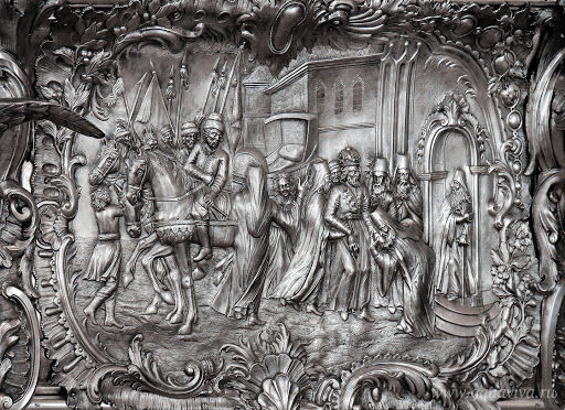 Несколькими месяцами ранее, в июне 1724 года, Святейший синод вынес постановление: Александра Невского «в монашеской персоне никому отнюдь не писать», а изображать следует «во одеждах великокняжеских». И именно таким, «в рыцарских доспехах и царской мантии, отороченной горностаевым мехом», святой изображен московским иконописцем Андреем Меркурьевым-Поспеловым «со товарищи» на иконостасе Петропавловского собора в Санкт-Петербурге.