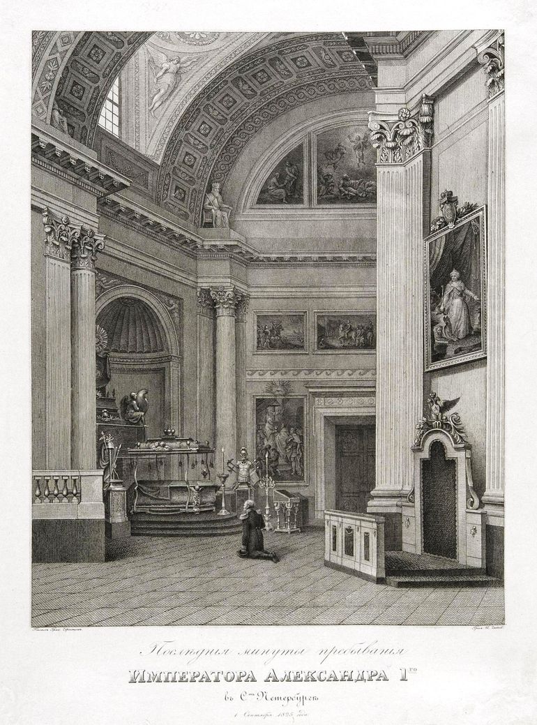 Гравёр-И. В. Ческий. Рисунок-Григорий Григорьевич Чернецов «Коленопреклоненный Александр I в соборе Александро-Невской лавры». 1825 Эрмитаж, Санкт-Петербург.