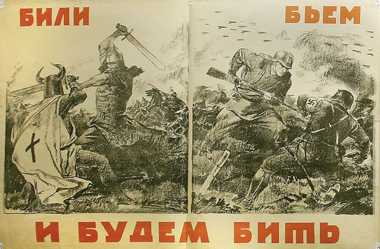 А годом ранее, в 1941-м, уже в первые дни войны на ленинградских улицах появился плакат кисти этого художника «Били, бьем и будем бить», в котором использован экранный образ великого князя, блестяще созданный актером Николаем Черкасовым. Название плакату дали слова из песни на стихи Василия Лебедева-Кумача «Мы врага встречаем просто: били, бьем и будем бить».