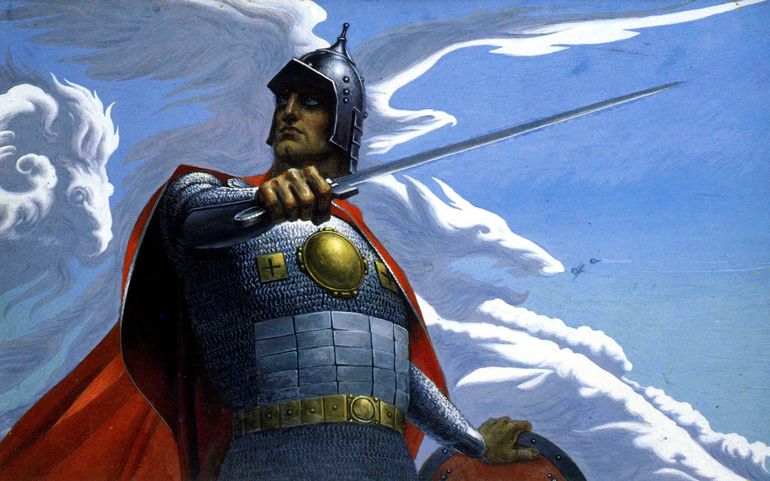 На картине Константина Васильева изображен витязь с мечом. По преданиям, у Александра Невского был меч, наделяемый некими мистическими свойствами и всегда вызывал интерес у современников и потомков. Сказание гласит, что во время Невской битвы, атакуя врага, князь занес над ним меч и все увидели, что от оружия исходит свет. Поэтому князь не проиграл ни единого сражения.