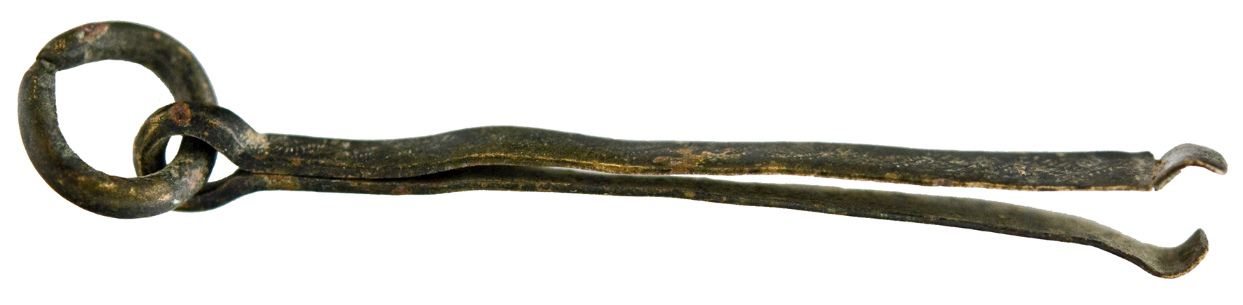Редкий бронзовый пинцет с кольцом, найденный при археологических раскопках в одном из древних захоронений Северного Кавказа. Входил в личную коллекцию одного из советских ученых — этнографов, относившего пинцет к кобанско-тлийской культуре и датировавшего его примерно X-IX веком до нашей эры. Впрочем, прошедшие два тысячелетия практически не сказались на состоянии артефакта. Сохранность отличная.